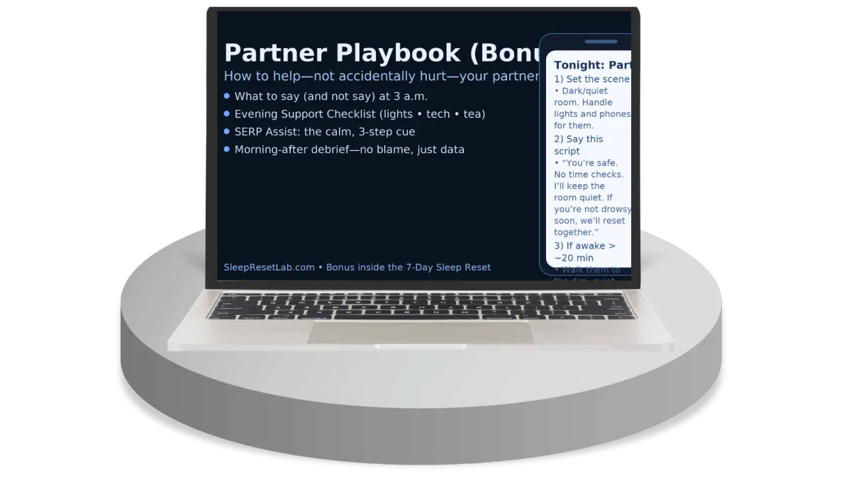Your gentle scripts, plug-and-play setups, and a one-page promise so both of you get great sleep—no matter the snoring, schedules, or temperature preferences.